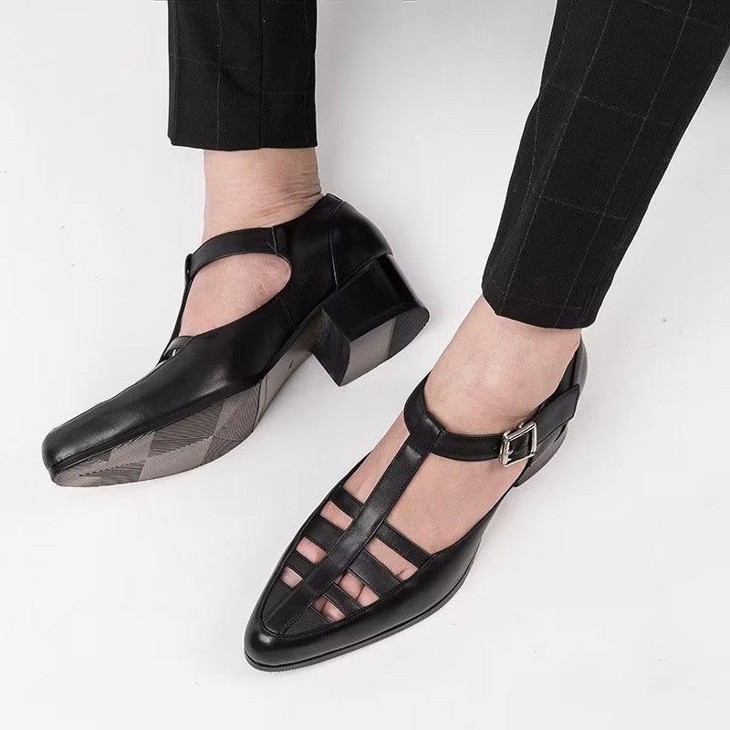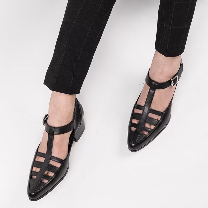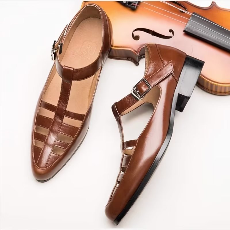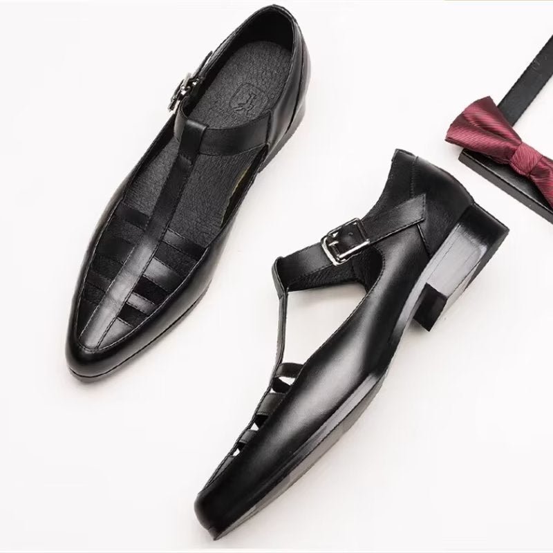 Maak Kennis Met Onze Leren Casual Schoenen Voor Heren, Brogue-Sandalen, Een Perfecte Mix Van Verfijning En Comfort. Deze Sandalen Zijn Gemaakt Met Een Bovenwerk Van Echt Rundleer En Een Voering Van Varkensleer, Hebben Een Spitse Neus En Een Veilige Gespsluiting. Met Een Rubberen Buitenzool Voor Duurzaamheid En Een Volnerfleer Binnenzool Voor Extra Comfort, Zijn Deze Sandalen Een Must-Have Voor Elke Stijlvolle Persoon. Breid Uw Schoenencollectie Vandaag Nog Uit Met Onze Leren Casual Schoenen Voor Heren.
